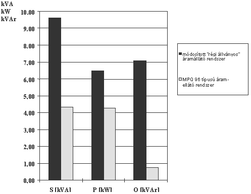4. ábra.A Hort-Csány állomás D55 tipusú vasúti biztosító berendezését tápláló, módosított "állványos" és az MPQ96 tipusú szünetmentes áramellátó rendszer energetikai jellemzőinek összehasonlítása