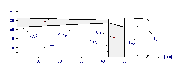 4. ábra.70 A névleges kisütő áram esetén a terhelésen átfolyó áram hullámalakja: IT(t) és –amplitúdója: IT (hullámosság nélkül) ; az akkumulátor áram középértéke: IAK , – pillanatértéke: iA(t) és hullámossága: DiA p-p ; a C kondenzátor telepből kivett : Q1 és a -telepbe bevitt: Q2 töltésmennyiség ; kitöltési tényező: δ.